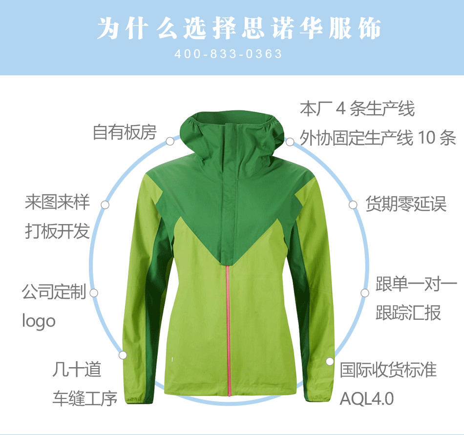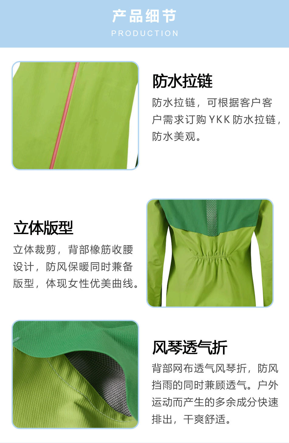 立體版型:后背收腰設計,立體裁剪,防風保暖同時兼備版型,體現女性優美曲線,專業單層壓膠衣定制