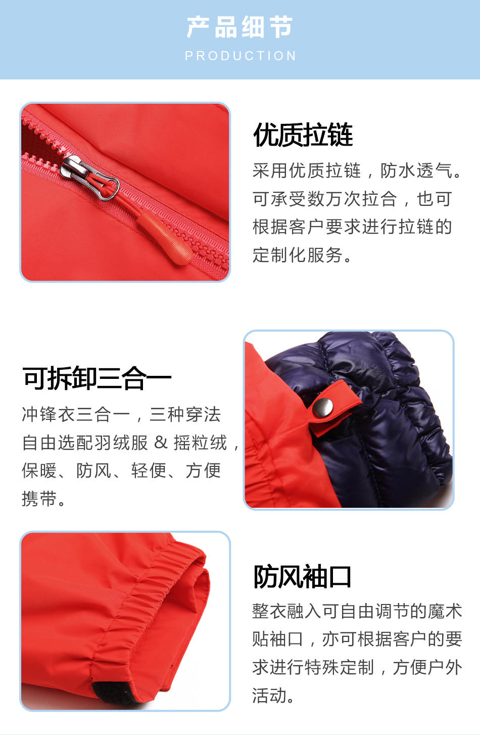 • 可拆卸三合一校服沖鋒衣三合一,三種穿法自由選配羽絨服&搖粒絨,保暖、防風、輕便、方便攜帶。