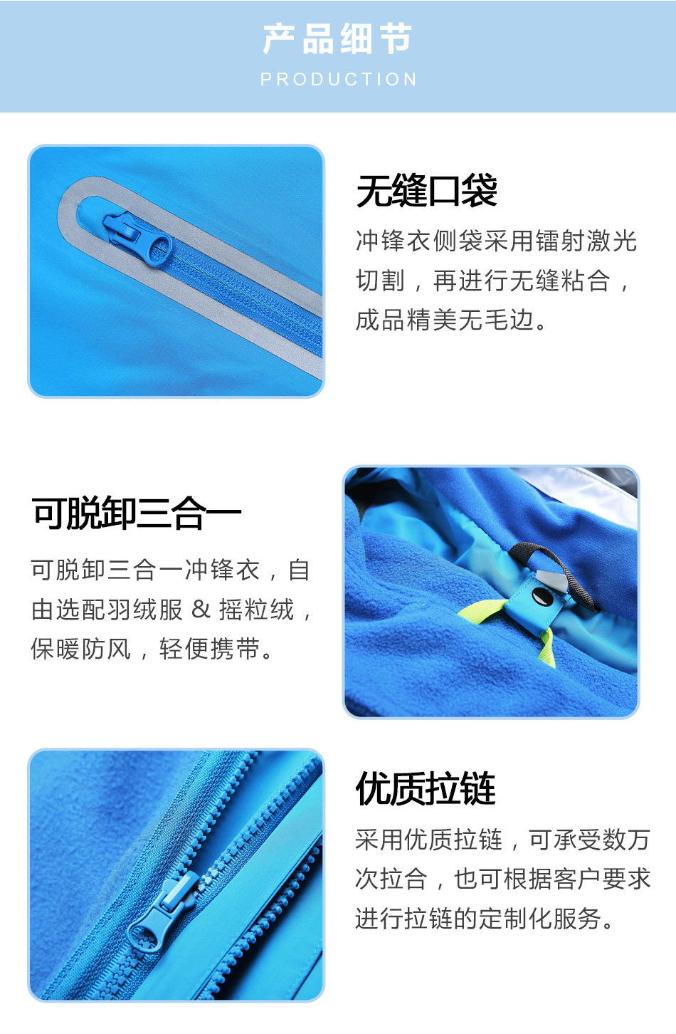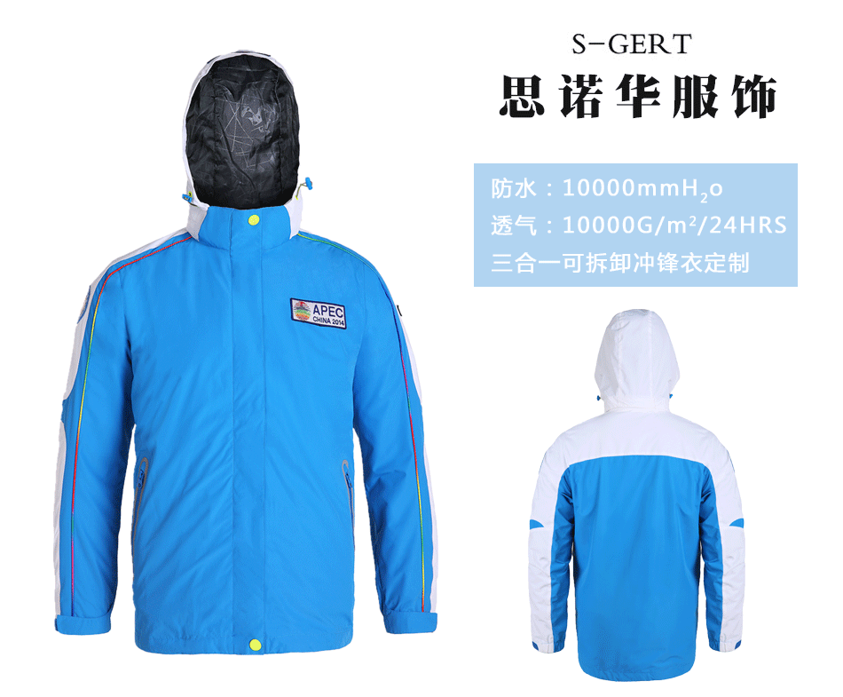 可脫卸三合一沖鋒衣:可脫卸沖鋒衣定制,自由選配羽絨服&搖粒絨,保暖防風,輕便攜帶。