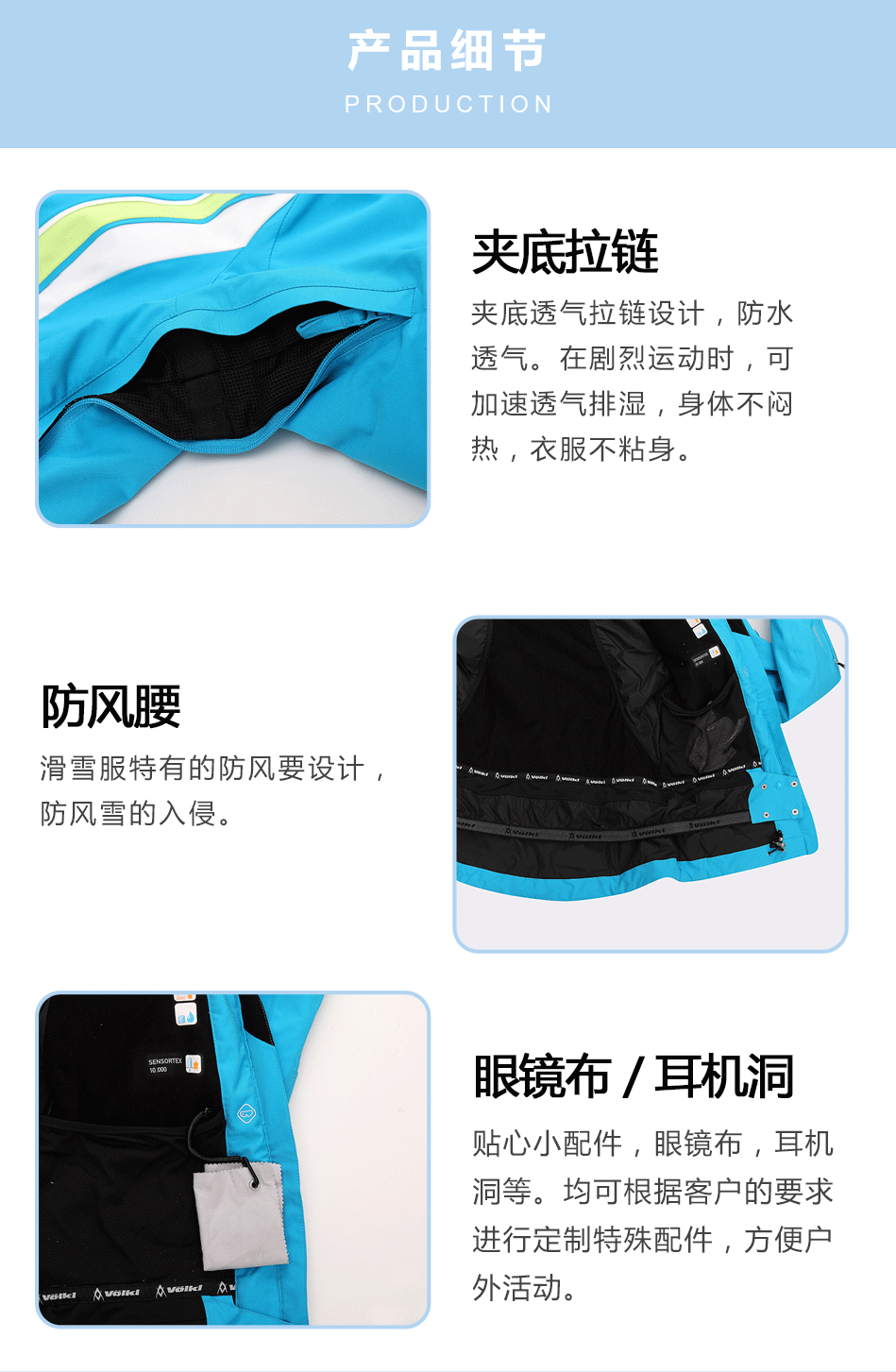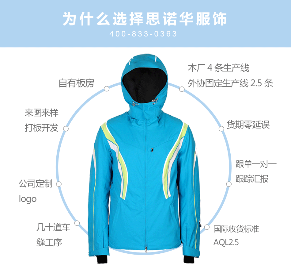 防水拉鏈采用無縫壓膠防水拉鏈激光熱封工藝貼合,面料采用進口防水透氣涂層膜,使防水透氣膜與面料完美結合。可根據(jù)客戶需求生產(chǎn)加工沖鋒衣。