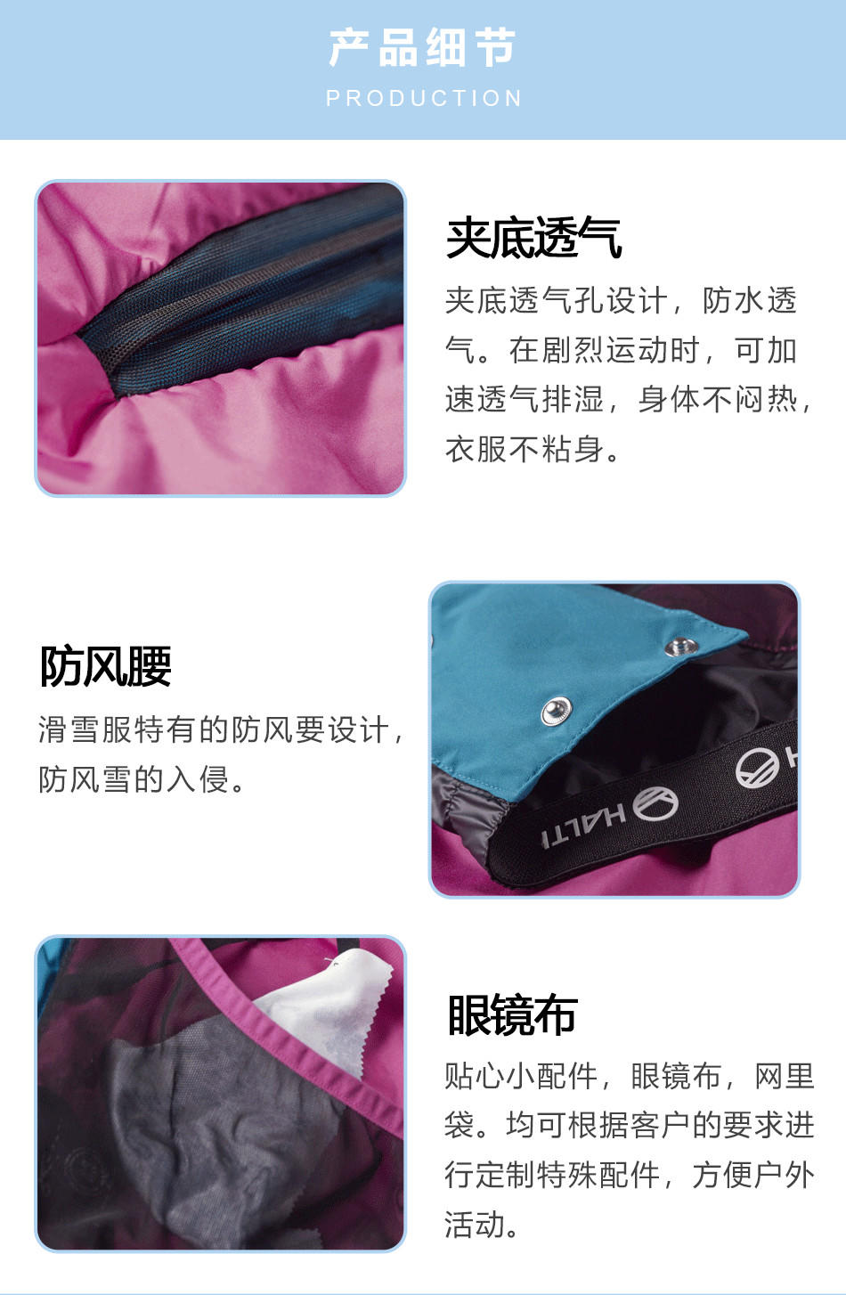 【網(wǎng)袋&眼鏡布】貼心小配件,網(wǎng)里眼鏡布,均可根據(jù)客戶要求定制滑雪服貼牌生產(chǎn)的小配件。