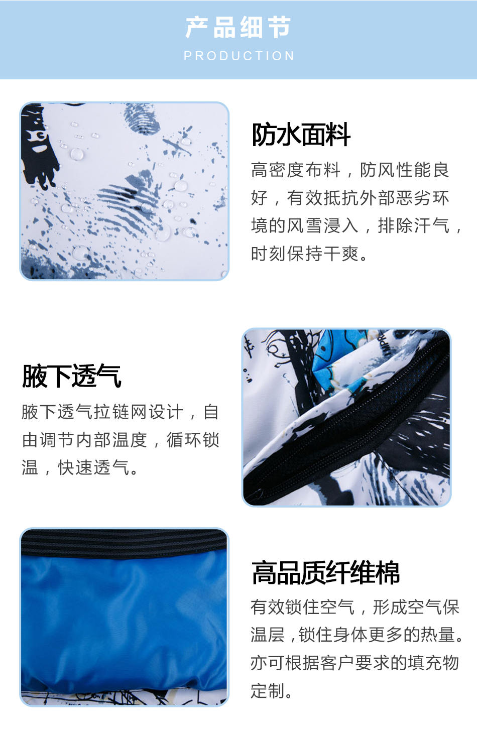 • 高品質纖維棉:有效鎖住空氣,形成空氣保溫層,鎖住身體更多的熱量。亦可根據客戶要求的填充物進行保暖滑雪服定制