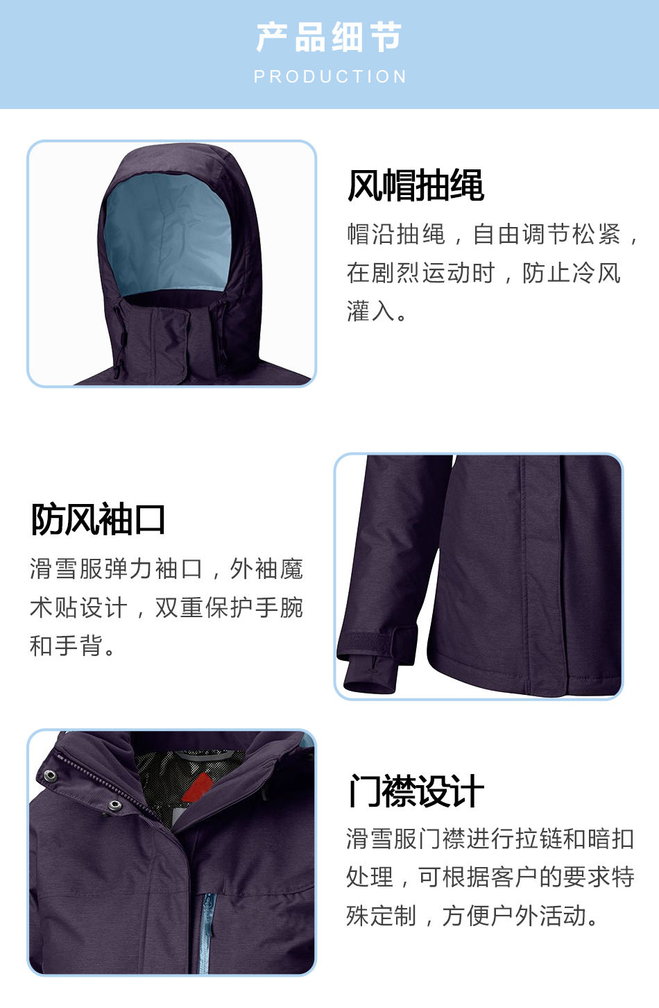• 門襟處理滑雪服生產的門襟進行拉鏈和暗扣處理,可根據客戶的要求特殊定制,方便戶外活動。